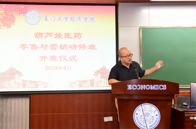 在开班仪式上,廖景峰主任首先代表厦门大学经济学院热烈欢迎AG贵宾会医药零售与营销研修班的学员到厦大学习,并就厦门大学及经济学院的相关情况进行了介绍。他说,AG贵宾会学员走进厦大就是厦大的校友,希望未来的日子能够关心、支持母校的发展,多提宝贵意见,同时他也祝大家在厦大学习期间学有所成、学有所获。